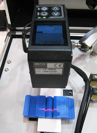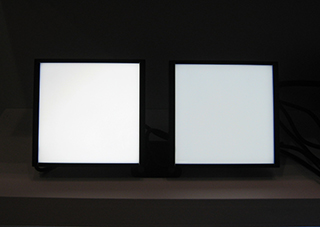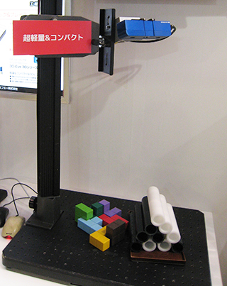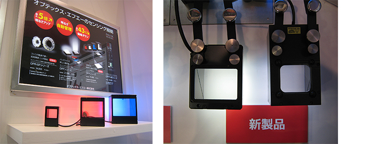 またOPXシリーズの光源として使用されているバックライト照明OPFシリーズも展示。左:狭指向角タイプ、右:拡散タイプ。指向性の狭い照射により余計な反射による光の回り込みを抑え、ワークの輪郭を鮮明に撮像可能です。
