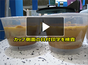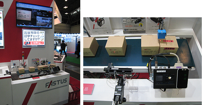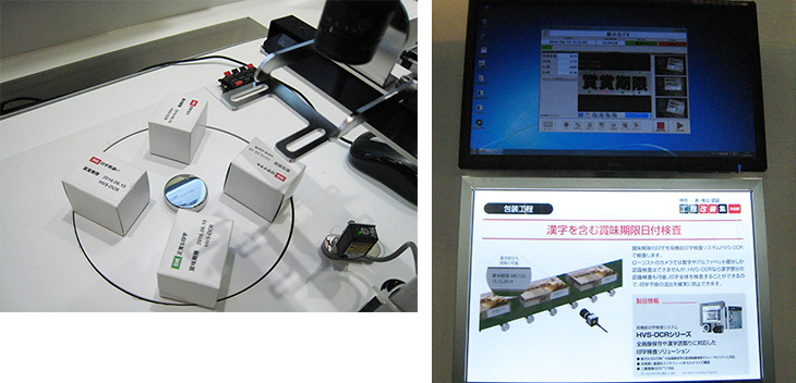 高機能印字検査システムHVS-OCRで、高速回転するテーブル上の小箱に印字された漢字の「賞味期限」と日付を検査するデモンストレーションを行いました。