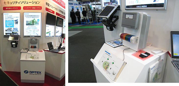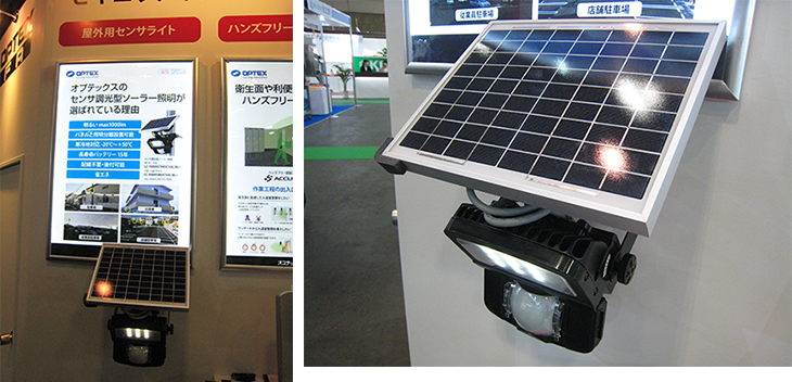 センサ調光型ソーラーLED照明を展示しました。虫がよりにくく、食品工場の出入り口や駐車場に最適。また、電源が不要で簡単に設置できます。