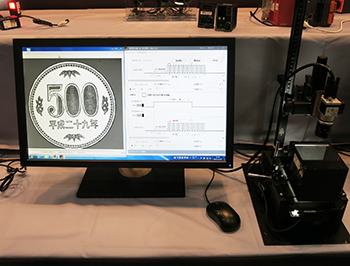 イーサネット対応LED照明コントローラ「OPPD-30E」と6つの照明を使用し、500円硬貨の撮像デモを行いました。