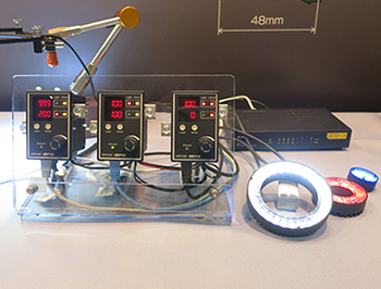 従来比2.5倍の明るさを実現したリング照明OPR-SFシリーズは、温度保護回路により一定の温度以上になると自動消灯します。OPPD-30Eと接続し、「自動消灯」をモニタリングするデモンストレーションを実施しました。