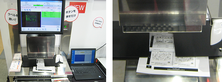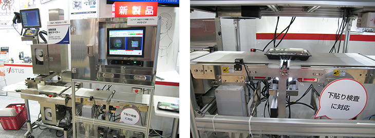 今回はイシダ社製の自動貼付ラベラーAL-AIとコラボ展示を行い、ラベル貼付けから印字検査の連動デモンストレーションを行いました。「HVS-CV」は、弁当や惣菜に貼付されている食品表示ラベルの一括表示内容を、インライン上で瞬時に照合検査できるラベル印字検査システムです。オプションで下貼りラベル用のカメラを搭載でき、ワークの天面と底面に貼られたラベルの同時検査が可能となっています。