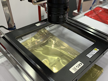赤・金・銀の光沢パウチに印字された賞味期限の印字検査を行いました。背景が変化しても安定して文字だけを抽出する「MVS-OCR2」の対応力をご覧いただきました。