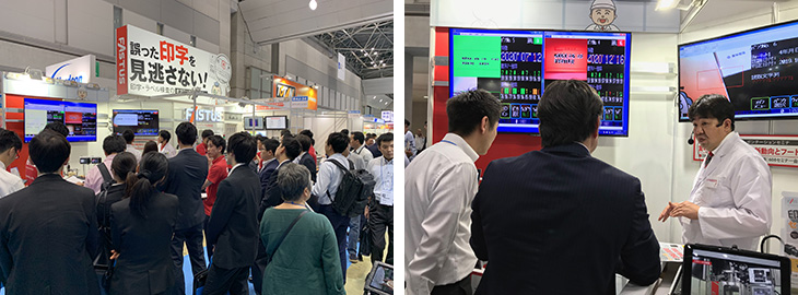 ブース前では、印字検査専門スタッフによるプレゼンテーションを行いました。印字検査機「MVS-OCR2」の強みやポイントのご紹介、3ステップのかんたんティーチング方法のデモンストレーションなどをご覧いただきました。お客様からのご質問にその場でお答えするなど、常にブース前は大盛況でした!