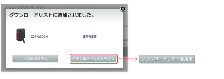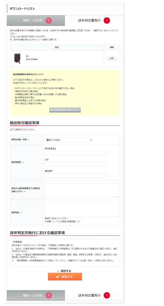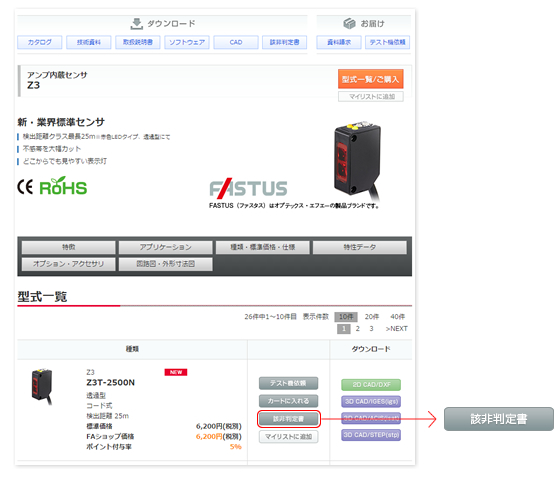 各シリーズの型式一覧画面に表示されている「該非判定書」ボタンをクリックし、該非判定書をダウンロードしていただけます。