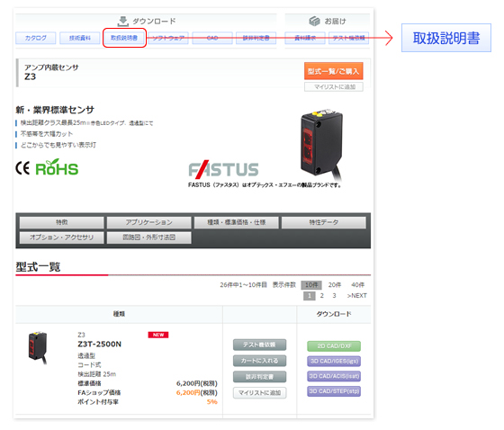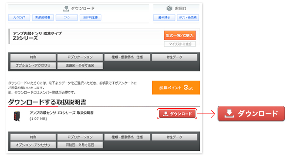 シリーズ詳細ページ右上に表示されている取扱説明書ボタンをクリックして、簡単なアンケートに答えるだけでダウンロードしていただけます。