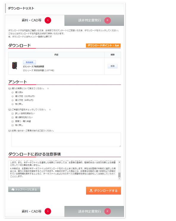 最後に簡単なアンケートに回答いただき、ダウンロードするボタンをクリックしてください。