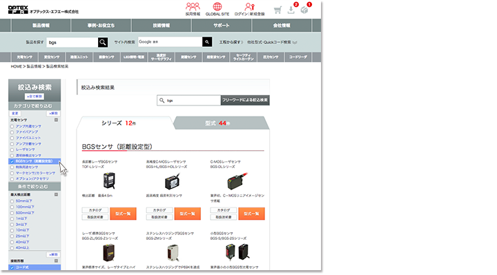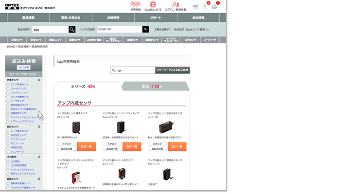 オプテックス・エフエー製品を型式もしくはシリーズを入力すると該当の製品リストが表示されます。