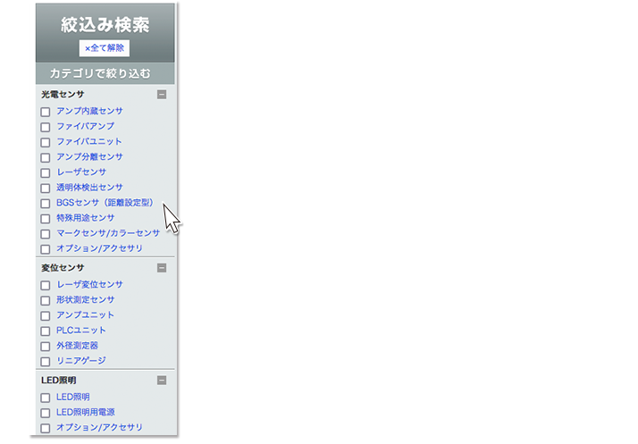 型式、シリーズ、他社の形式で検索結果ページや各シリーズの詳細ページからカテゴリ選択すると、製品の検出方法などで製品を絞り込むことができます。