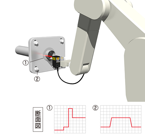 自動車部品における①パイプの出代の計測検査(1個×4点)②ボルトの浮き検査を(4個×2点)をロボットに搭載した形状測定センサLSシリーズにて行います。