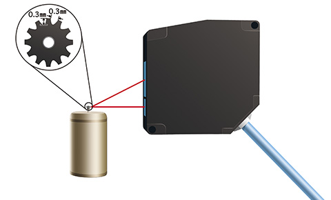 ギヤの歯が小さく光電センサでは段差を判別できないので、レーザ変位センサを使用します。CDX-30ならスポット径がφ30μmなので、ギヤの1つ1つを検出することが可能。また新開発の受光素子ATMOSはフィードバックレスの高速シャッターを実現しているので、一瞬の測定不能や応答の遅れがない測定を実現しています。