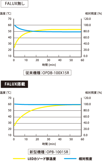 温度による明るさ変動の解決方法として、照明に温度補償回路を内蔵した。これはLED 照明の色毎に異なる温度変動特性により、電流値の調整で明るさを補正するものである。これにより温度による明るさ変動は1~2%程度となり、従来品比1/20 まで変動を抑えることができ業界最高水準を達成している(図1)。