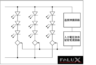 これら入力電圧依存型定電流回路と温度補償回路をあわせて当社では“FALUX(ファルクス)”と呼んでおり、特許出願中である(図2)。