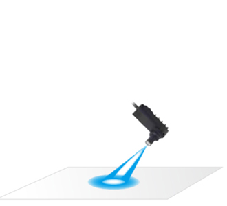 また、高輝度タイプは従来よりも指向性が強いため、直接照射の斜光照明としても十分使える。さらにオプションの集光レンズを装着することによって、より長距離小スポットでの照射が可能となる。以下が距離による集光径と照度のデータとなる(図8)。
