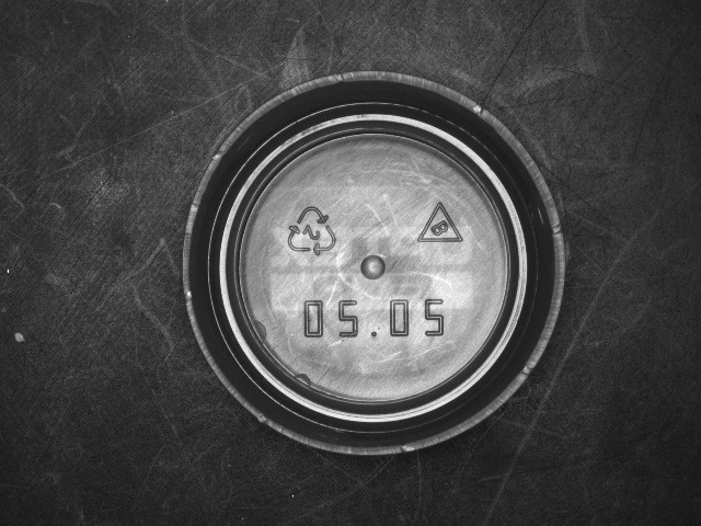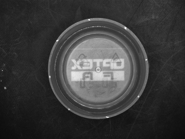 同軸照明OPXを用いることでキャップのフラット面を白く撮像し、凸型の英数字を黒く撮像します。またペットボトルキャップは薄く、外側のロゴや模様が透けやすいため、透過しづらい照明色を選定しています。