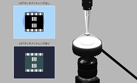 従来、吸着ノズルが背景に写り込むことでエッジをうまく検出できませんでした。OPRであれば、アタッチメントレンズを使用することでローアングル照射に切り替えが可能です。ローアングル照射によりチップ部品のみに光を当てることで、ノズルと背景を見ずにチップ部品のエッジのみくっきりと撮像できます。