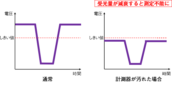 東京光電子工業のLMGシリーズは、受光量の低下に影響を受けにくい、エッジ判定方式を採用しております。レンズ面の汚れ等により受光量が下がっても、受光レベルの変化量が確認できれば、継続して測定する事か可能です。