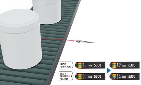 超高速デジタルアンプD4RF-TDなら、出力を2つ装備しているので、出力2を受光量のモニタリング用に設定しておけば受光量の低下を検出可能。メンテナンスのタイミングを事前に知ることができ、ダウンタイムの削減につながります。