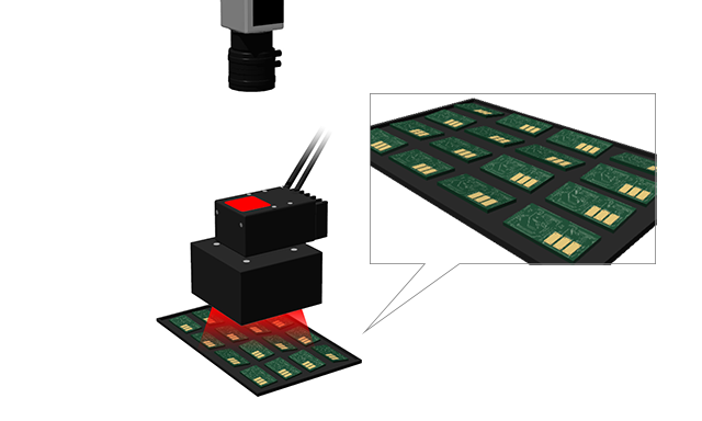 同軸照明と角型照明を組み合わせることで均一性が向上し、またメッキ部分と緑の基板のコントラストを強調するために赤色照明を選定することで、安定したアライメントを可能にします。