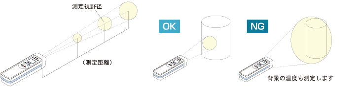 非接触(放射)温度計は、物体表面の面積の平均温度を測定します。この面積を測定視野といいます。測定視野は、温度計から測定対象物までの測定距離によって変化します。また測定視野と測定距離の関係は、各製品によって異なります。正しく測定するためには、測定したい箇所の面積が、測定視野を十分に満たすことをご確認下さい。