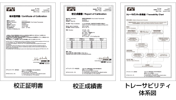 また、校正証明書類をお求めの場合は「校正証明書」「校正成績書」「トレーサビリティ体系図」3点一式でご提供(有償)しております。