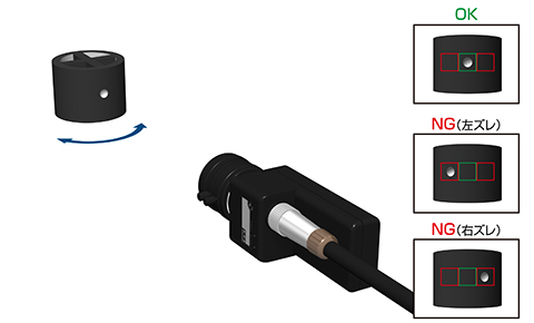 光電センサでは正確に位置決めをしてからでないと判別できませんが、広い視野を持つ画像センサならラフな位置決めでもエンボス部を検出可能。黒ゴムワークの方向を簡単に判別することができます。